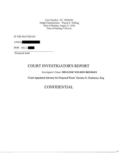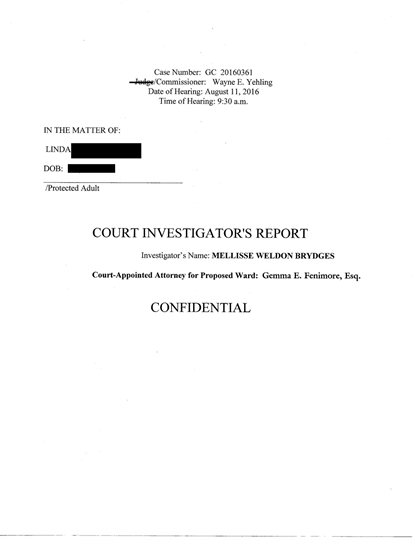 The new investigator did her job right, as expected from a master licensed social worker with a masters degree (Sandra Paz), Thank you Mrs. Paz!! Regardless of these facts, Brydges, in her delusions, still believes I stole a large sum of money. Below are her report's filed in the case. Please note that Brydges has zero education in the areas she pretends to be an expert in. Nonetheless, it is not the job of the investigator to make professional or medical determinations, like she attempts to. She is not a physician, and she is not a licensed social worker. She even admitted in court that she has no clue what Dementia or Alzheimer's is.