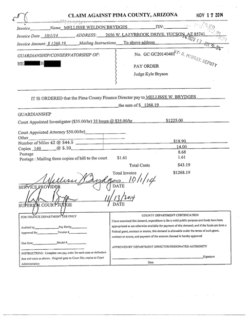 GC20140481 - Guardianship Case. Ms. Brydges, even after being told several times NOT to exceed the court's 10 hour limit, before asking permission, exceed the limit by 25 hours and then asked. Of course the court always allows this behavior. So she just keeps doing it, at the expense of the Pima County Taxpayers!!